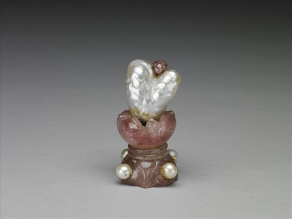 帽頂,粉紅碧璽花形座上嵌一似愛心形珍珠,座四周鑲珍珠四顆。帽頂是清朝君臣與命婦所著冠帽頂部的飾物,依其所嵌珠寶的質材與數目,以區別品秩。