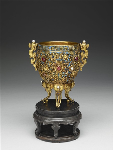 此件元旦開筆儀式御用的〈金甌永固杯〉,於乾隆四年(1739)製作,以黃金打造,夔龍為耳、三象頭捲鼻成足,器身鏨刻纏枝寶相花,口沿飾帶狀回紋,回紋中間一面鏨刻篆書「金甌永固」,一面刻「乾隆年製」,以點翠為地,嵌有珍珠及紅藍寶石。由於歷經長年使用而有傷損,故於嘉慶二年(即乾隆六十二年,1797)下令,重新製作,新做〈金甌永固杯〉現存於北京故宮博物院。新舊〈金甌〉在尺寸、外觀上幾乎相同,以黃金製成象徵國家政權的「金甌」,〈金甌永固〉無疑是最直接具體的表現。