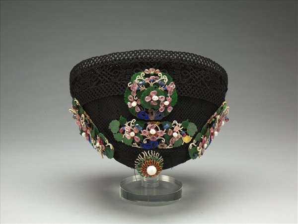 金屬胎,黑緞覆之。冠前、兩側及冠頂飾珠寶料石鈿花七,額首式火焰鈿花,正中嵌大東珠。