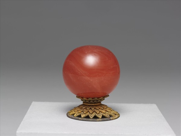 清代官員頂戴用寶石,一品官為尖晶石,二品官為珊瑚,三品至六七依次用藍寶石、青金石、水晶、硨磲。雍正八年以顏色相同的玻璃代替寶石,一至六品分別為紅色明玻璃、紅色涅玻璃、藍色明玻璃、藍色涅玻璃、白色明玻璃、白色涅玻璃。此件為紅色涅玻璃(就是不透明玻璃)相等於珊瑚。