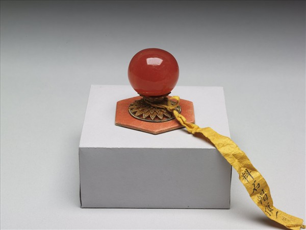 清代官員頂戴用寶石,一品官為尖晶石,二品官為珊瑚,三品至六七依次用藍寶石、青金石、水晶、硨磲。雍正八年以顏色相同的玻璃代替寶石,一至六品分別為紅色明玻璃、紅色涅玻璃、藍色明玻璃、藍色涅玻璃、白色明玻璃、白色涅玻璃。此件為紅色涅玻璃(就是不透明玻璃)相等於珊瑚。