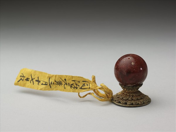 暗紅不透明頂珠,附銅鍍金纍絲蓮瓣紋托座。珠面顯露若干雜質與砂眼。