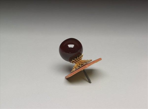 銅鍍金纍絲菊瓣紋托座,支承暗紅珠頂。紅玻璃發色穠沉,有如天然寶石。