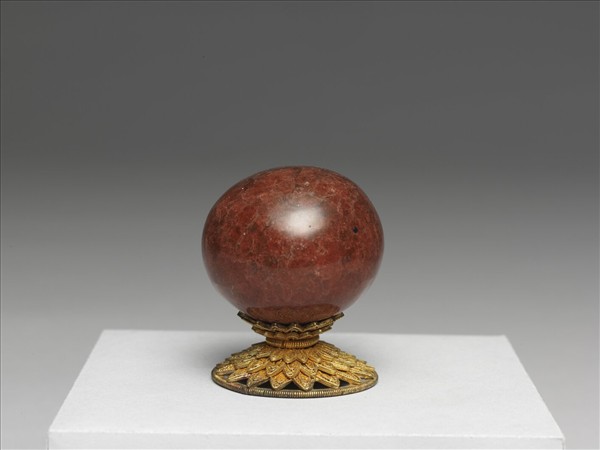清代官員頂戴用寶石,一品官為尖晶石,二品官為珊瑚,三品至六七依次用藍寶石、青金石、水晶、硨磲。雍正八年以顏色相同的玻璃代替寶石,一至六品分別為紅色明玻璃、紅色涅玻璃、藍色明玻璃、藍色涅玻璃、白色明玻璃、白色涅玻璃。此件為紅色涅玻璃(就是不透明玻璃)相等於珊瑚。