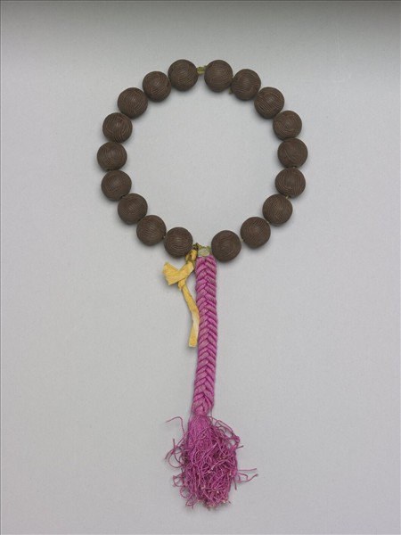 此件非茄楠原木製成之手串,而是以茄楠粉混合中藥做成香泥製成,將香泥做成大小相同的珠子,再以劃刀畫出如鈕扣結之紋樣。至今仍散發出淡淡幽香。