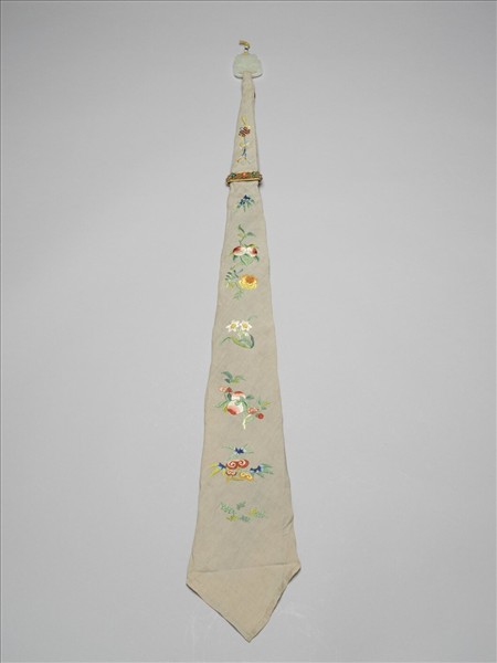 綵帨是繫於胸前,上窄下寬而銳的綢帶,造形類似現在的領帶,只是長可過膝,上端有掛環,可固定在朝褂的鈕扣上,環上佩箴、管、縏、袠等墜角的絲縧。皇后、皇貴妃朝服的綵帨為綠色,繡五穀豐登,佩箴、管等,明黃縧。貴妃用縧為金黃色,妃繡文為靈芝瑞草,餘同貴妃。嬪不繡文。此件為彩繡,為灰色絲綢上繡靈芝、壽桃、水仙及菊花,繫於玉獸面紋環上,並束一金纍絲嵌珊瑚松石巾束。滿人婦女習俗佩巾,除了冠服禮制時規範佩戴的樣式之外,如此作工講究的綵帨,穿著吉服及常服時也可以佩戴,作為裝飾。
