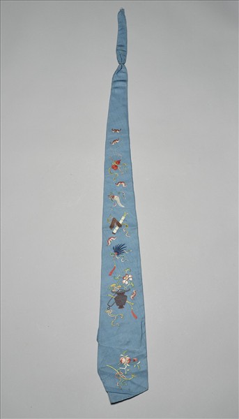 綵帨是繫於胸前,上窄下寬而銳的綢帶,造形類似現在的領帶,只是長可過膝,上端有掛環,可固定在朝褂的鈕扣上,環上佩箴、管、縏、袠等墜角的絲縧。皇后、皇貴妃朝服的綵帨為綠色,繡五穀豐登,佩箴、管等,明黃縧。貴妃用縧為金黃色,妃繡文為靈芝瑞草,餘同貴妃。嬪不繡文。此件為彩繡,為藍色絲綢上繡葫蘆、笛、花籃、陰陽版等圖案。滿人婦女習俗佩巾,除了冠服禮制時規範佩戴的樣式之外,如此作工講究的綵帨,穿著吉服及常服時也可以佩戴,作為裝飾。