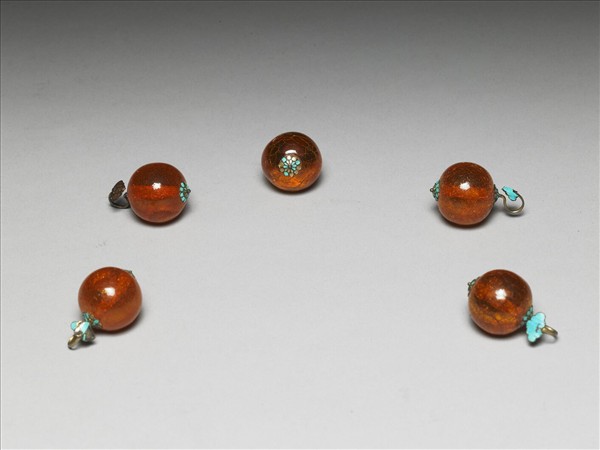 橘紅色松香掛料鈕子,圓球狀,有通心穿,金屬條貫穿其間,固定了通心穿兩端的壽字紋金屬飾片。金屬條一端為兩層瓣花形飾片,一端亦見兩層瓣花形飾片,金屬條伸出拗彎如鉤狀,並接連一如意雲頭狀飾片,金屬飾片皆飾點翠,雖局部點翠有脫落的現象,但整器仍有如一顆顏色對比亮眼的果實,一起吸引人們的目光。