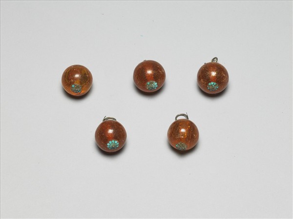 橘紅色松香掛料鈕子,圓球狀,有通心穿,金屬條貫穿其間,固定了通心穿兩端的壽字紋金屬飾片。金屬條一端為兩層瓣花形飾片,一端亦見兩層瓣花形飾片,金屬條伸出拗彎如鉤狀,並接連一如意雲頭狀飾片,金屬飾片皆飾點翠,雖局部點翠有脫落的現象,但整器仍有如一顆顏色對比亮眼的果實,一起吸引人們的目光。