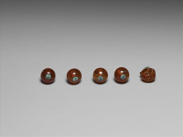 橘紅色松香掛料鈕子,圓球狀,有通心穿,金屬條貫穿其間,固定了通心穿兩端的壽字紋金屬飾片。金屬條一端為兩層瓣花形飾片,一端亦見兩層瓣花形飾片,金屬條伸出拗彎如鉤狀,並接連一如意雲頭狀飾片,金屬飾片皆飾點翠,雖局部點翠有脫落的現象,但整器仍有如一顆顏色對比亮眼的果實,一起吸引人們的目光。