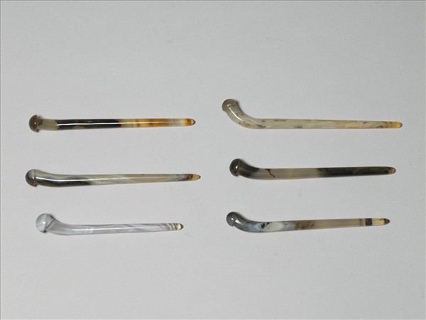 大小瑪瑙質素鋌簪六支,近簪首處略弧折,簪首琢為一類半圓形球面,有如菇類。整器雖光素無紋,但瑪瑙有如乳湯狀暈染的天然質理,讓素鋌無紋的簪子,也顯得相當悅目。