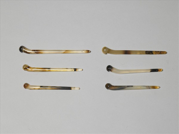 大小瑪瑙質素鋌簪六支,近簪首處略弧折,簪首琢為一類半圓形球面,有如菇類。整器雖光素無紋,但瑪瑙有如乳湯狀暈染的天然質理,讓素鋌無紋的簪子,也顯得相當悅目。