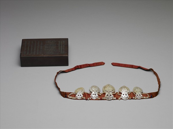 五佛冠為珠母貝殼刻成,每葉作髑髏首頂著火焰,是佛的忿怒像。其中央一葉,背後淺刻折枝梅花圖,運刀流暢,顯然係由漢人所做的物件改刻成。五佛葉縫在紅布繫帶上,並飾珍珠、珊瑚珠、青金石珠於其間,繫帶一端墨書經咒字。據木匣漢、藏、滿、蒙四體題記,此件五佛冠原為扎什倫布寺法器。