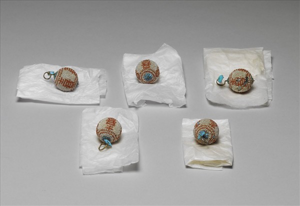 以白色珊瑚珠為底,緝紅色珍珠喜字,上下圍繞兩圈,鈕頂層為如意掛鉤,底為單層花瓣紋,均點翠,銀鈕鉤。