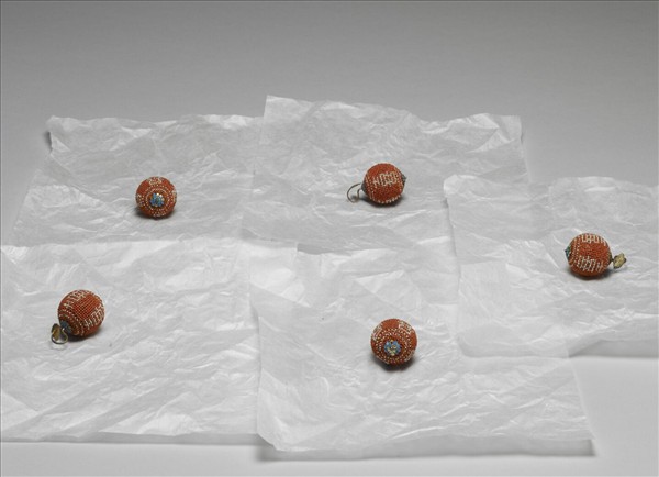以珊瑚珠為底,緝白色珍珠喜字,上下圍繞兩圈,鈕頂層為如意掛鉤,底為單層花瓣紋,均點翠,銀鈕鉤。