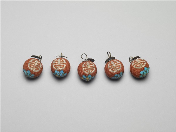 以珊瑚珠為地,緝珍珠團壽二,鈕頂層為如意紋掛鉤,底為雙層花瓣紋,均點翠,銀鈕鉤。黃籤:同治元年三月十七日收。