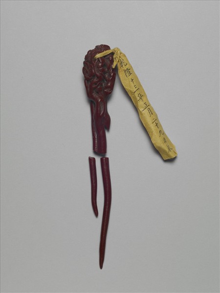 深紅色油珀頭簪,缺殘呈數節。此器與故雜6144為一對。