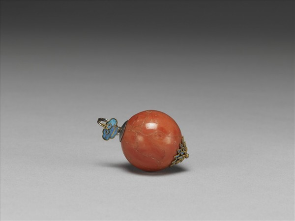 此為珊瑚鈕子,頂為點翠如意掛勾紋,底為三層藍色點翠花瓣紋,顏色鮮艷,作工精緻。