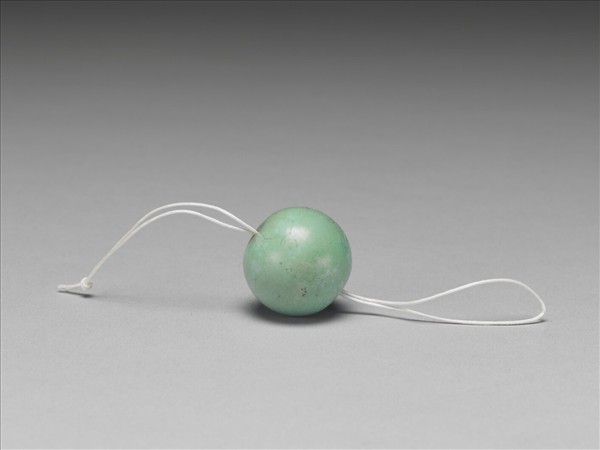 此為松石鈕子,淺綠、色圓潤,中有穿孔。