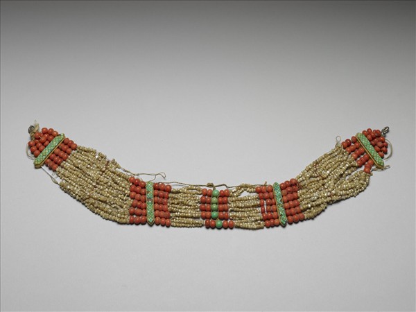 此為項鍊式嵌松綠石珊瑚米珠垂掛,米珠兩兩一組共六排,兩邊接珊瑚串,中串綠松石一排,左右兩端有環狀扣環。黃簽記載此為乾隆五十八年四月十一日收。