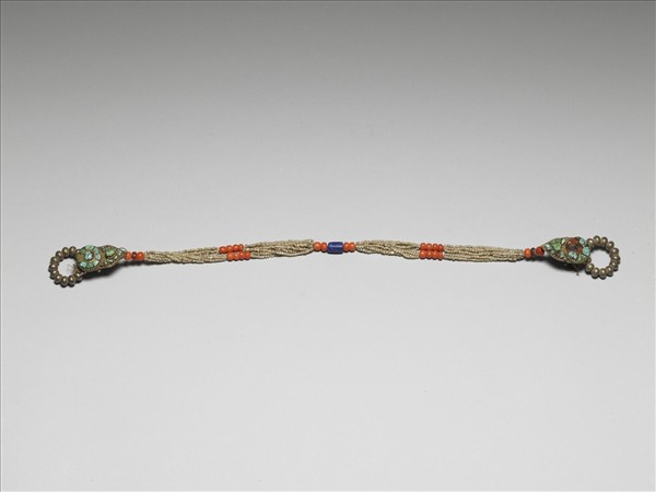 此為嵌松綠石珊瑚米珠垂掛,米珠兩兩一組共兩排,其餘殘。左右兩端有嵌松綠石牌,接珍珠環。