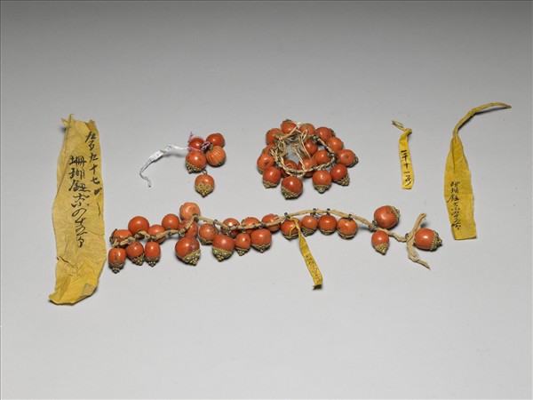 珊瑚鈕子,以棉繩串起,銅環於鈕頂層,底為三層藍色點翠花瓣紋,頂綴米珠。