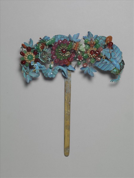 此為料石花枝,以珊瑚、翠玉、粉紅碧璽及各色料石製成花、蝶及昆蟲,另有點翠之鳥、蝶、花葉及「大吉」二字,整體生動活潑。扁平挺。