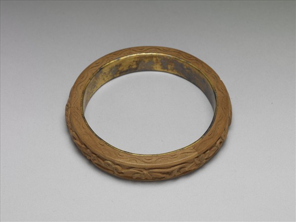 此為一對檀香鐲,內嵌扣金環。環面刻有纏枝花卉紋、「壽」、雙「福」字交錯。口沿刻環帶雲,圓點交錯於紋飾中。