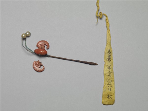 此為珊瑚嵌珠蝙蝠簪,一邊翅膀脫落,眼飾珍珠。包裝紙上墨書:「嘉慶十二年二月初六日收」。
