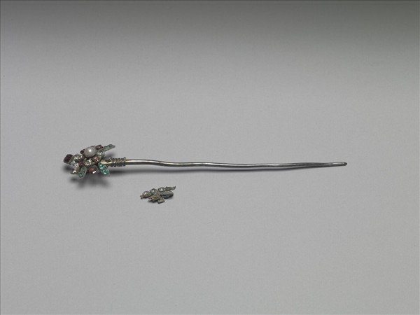 此為簪首做蝴蝶展翅樣式,通體嵌白色、紅色和綠色玻璃。此器與故雜6174為一對。