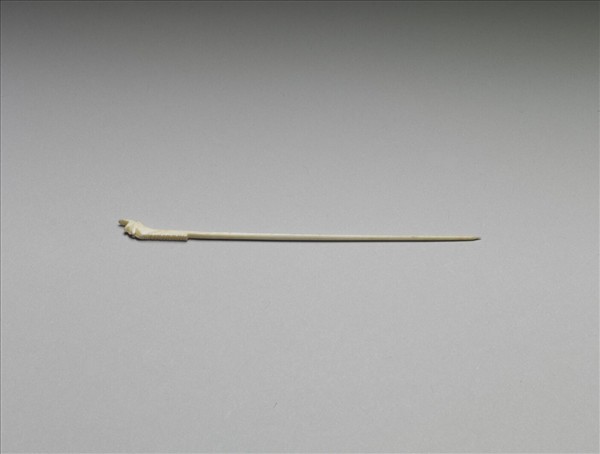 此為象牙製髮簪,首上有一圓洞,尾尖,素挺。