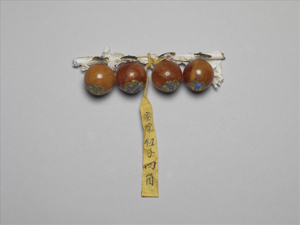珊瑚鈕子,四個一組,鈕頂層為如意紋掛鉤,底為雙層花瓣紋,均點翠,金屬鈕鉤。