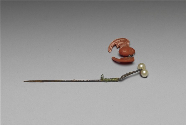 此為珊瑚嵌珠蝙蝠簪,觸鬚飾珍珠,軀體脫落,銀挺鏽蝕。