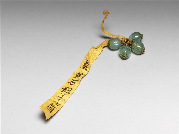 藍英石鈕,四個一組,鈕頂層為如意掛鉤,底為單層花瓣紋,均點翠。