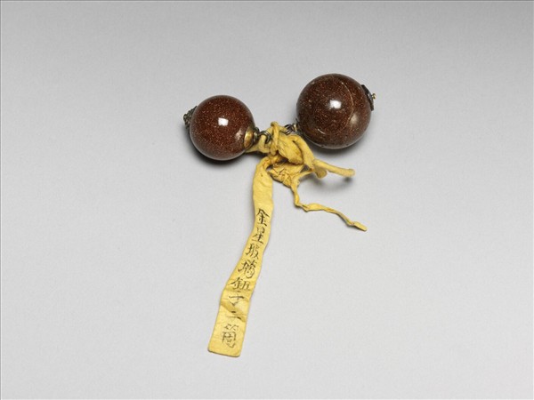 黃棕色玻璃珠二粒,玻璃內散布細密金色微粒,表面有若干砂眼小孔。珠粒頂端鑲花瓣型環釦,底部鑲菊瓣鍍金座。所附黃籤墨書「金星玻璃鈕子二箇/乾隆三十年五月二十二日收」。據清宮內務府造辦處《活計檔》記載,乾隆三年(1738)曾以溫都里那石製作銅鍍金鈕子帶頭。