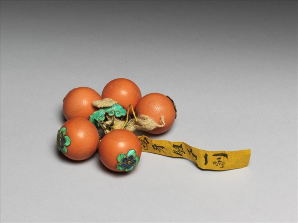 茜牙鈕,四個一組,鈕頂層為如意掛鉤,底為雙層花瓣紋,均點翠,金屬鈕鉤。