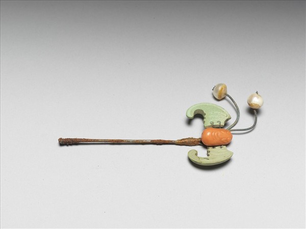 此為珊瑚松石蝠簪,以珊瑚為腹,左右雙翅為松石,觸鬚飾珍珠兩顆。