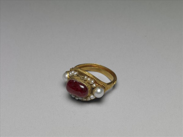 此為戒指為活口金箍,上嵌有紅色寶石,周繞小珍珠16顆,左右有大珍珠兩顆。戒指內側戳印「赤金、永積」。