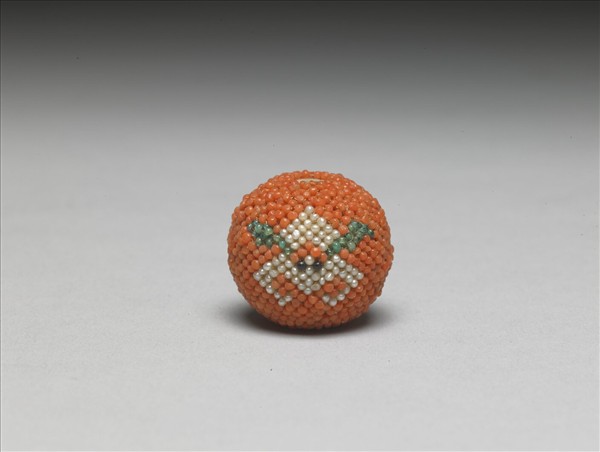此為珊瑚珠緝米珠鈕子,以紅色珊瑚珠為地,一面緝白米蝙蝠,另一面為卍字,有福、壽之意。