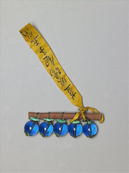此為藍玻璃紐珠,鈕頂為點翠如意紋掛鉤,底為點翠單層花瓣紋,銀鈕鉤。