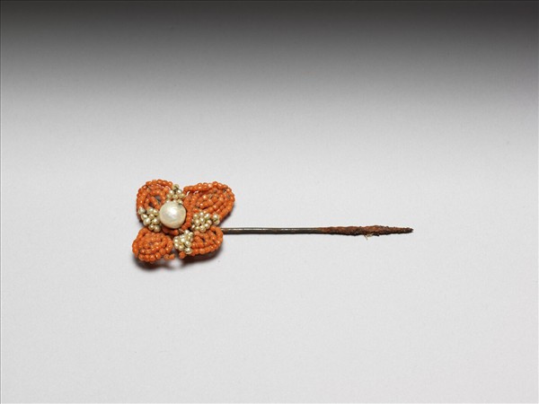 素鋌金屬簪,簪首緝以紅白二色米珠,略成一紅色四瓣花之貌,紅色花瓣間飾白色小瓣,花心以較大之珍珠表現,既細緻又多見貴氣。
