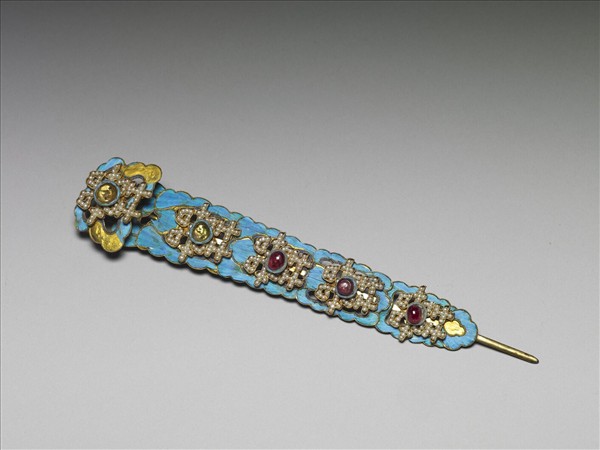 素鋌金屬簪,簪首所佔比例甚大,幾乎為整器的五分之四。簪首滿覆點翠,上緝米珠「囍」字,「囍」字中心又嵌飾一珍珠,整體便呈現出藍地白字,紅色寶石畫龍點睛的視覺效果。且整器的華麗貴重,不只表現在寶石或珍珠等珍貴的材料,還在於點翠施作質感如絨布,展現不計成本的精工巧作富貴之貌。