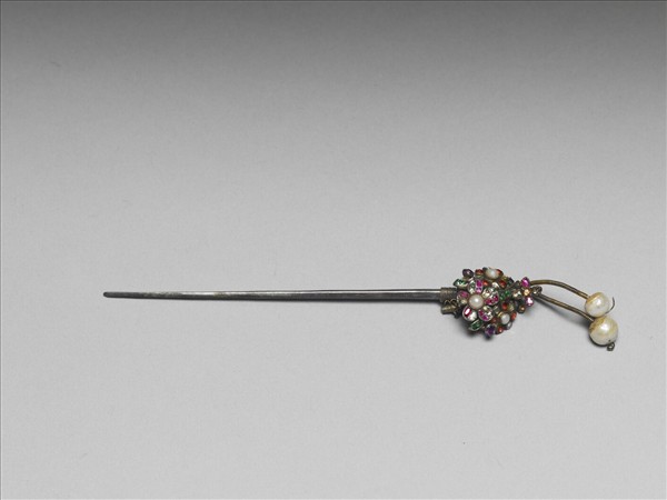 素鋌金屬簪,簪首朵花群聚,花心嵌珍珠,花瓣則填以各色玻璃,玻璃面上皆有細緻的切割,使其折射出炫麗奪目的光彩。簪首最上方又伸出兩段彈簧,彈簧頂端並接以珍珠,彷彿是蝴蝶的卷鬚,如此一來,那些閃耀奪目朵花群聚,似乎也就化成了蝴蝶的身體,成了名符其實的「花蝶」了。