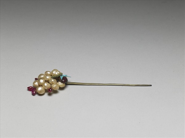 素鋌金屬簪,簪首以金屬絲線固定多顆珍珠與紅色寶石而成。珍珠雖未必呈正圓,但粒粒飽滿,在充當葉片的紅寶石襯托下,更突顯出特有的珍珠柔細光澤。點翠如花萼,宛如在一片結實纍纍的花果中,指出了視線聚焦之處。附黃籤,黃籤上一面墨書:「嘉慶五年十月初十日收,包衣昂邦呈」、另面:「覽穿珠花簪一枝,計碎小正珠十一顆,紅宝石六塊,銀挺,共重一兩五分。」