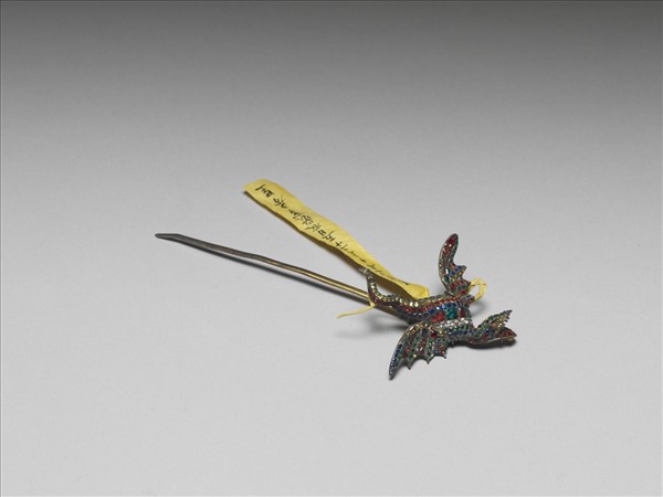 素鋌金屬簪,簪首作有翅異獸之形,有長尾蛇頭,蛇頭咧嘴露牙,狀甚可怕,又異獸表面以紅、藍、綠等色玻璃滿填,兩相映襯之下,展現出炫麗而讓人不安的美感。
