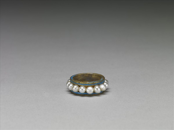 金屬戒子,戒面上下各飾點翠弦紋一周,戒面中央緝米珠為飾。米珠凸出戒面,又有點翠相襯,可說既顯眼又細緻的裝飾。