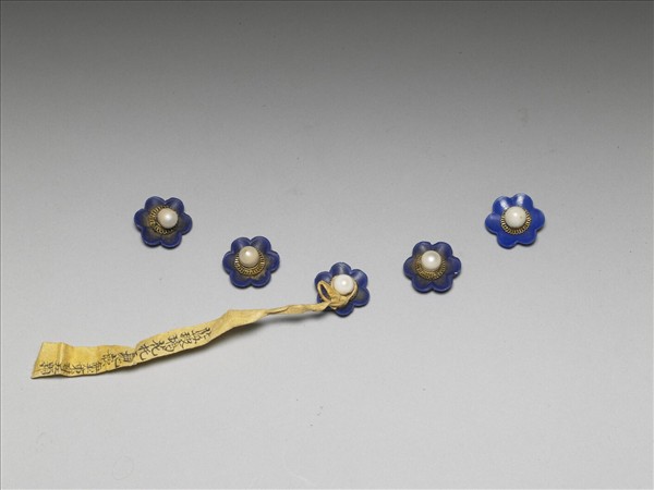 深藍色玻璃花托,作六瓣花式,中央花心處嵌飾鍍金座珍珠一顆,珍珠的白色光澤,被深藍色映襯的更為細緻而迷人。