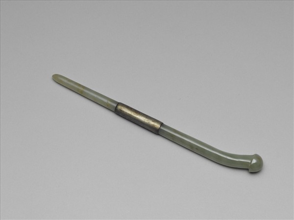 青白玉簪,體圓光素,中央有一長形銀環,簪首末端雕成蕈傘形,故雜6356及6357共儲於一包。