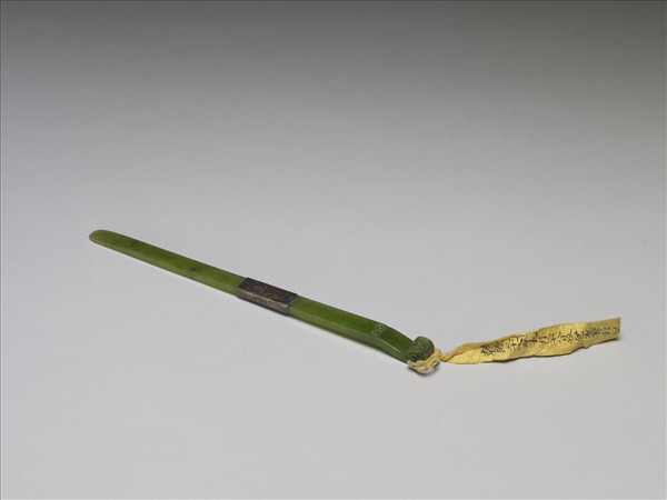 青玉扁方,作扁平一字形,一頭捲起,琢有人物紋,下方琢有捲雲紋,中央嵌有一方形銀環。扁方為滿族婦女梳旗頭時所插飾的特殊大簪。有黃籤,一面寫:「乾隆卅七年九月廿八日收包衣昂邦呈」,一面寫:「覽銀鑲碧玉廂方簪一枝/二接」
