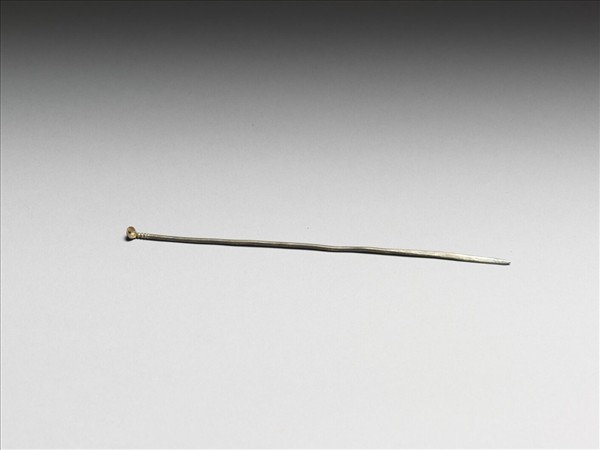 銀鍍金耳挖簪,簪首做小圓匙形,可用來掏耳;圓挺細而光素,末段扁,尾端尖,方便佩帶。有黃籤,一面寫:「嘉慶八年六月二十八日收敬事房呈」,一面寫:「覽銀耳挖三支/共重一錢五分」,故雜6377~6379共儲於一包。